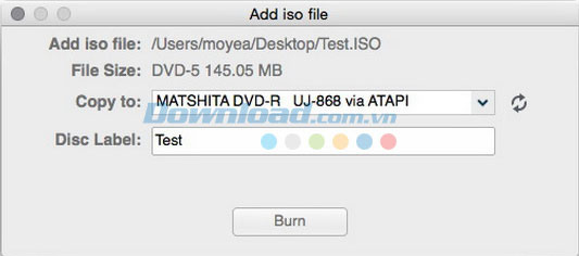 Sau khi nhập file ISO nguồn, sẽ một cửa sổ Add iso file xuất hiện. Lúc này, bạn cần thiết lập tùy chọn Copy to và Disc Label. Lựa chọn ổ đĩa cho tùy chọn Copy to và thiết lập Disc Label bất cứ khi nào mình muốn.