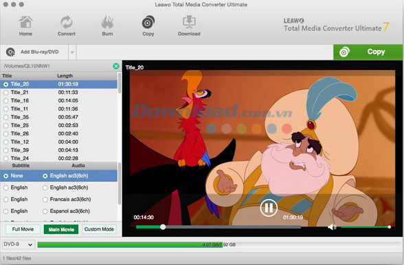Lưu ý: Khi nhập phim Blu-ray/DVD để chuyển đổi, bạn sẽ được cung cấp 3 chế độ: Full Movie, Main Movie và Custom Mode. Nếu lựa chọn Full Movie, chương trình sẽ nhập tất cả phim Blu-ray/DVD nguồn để chuyển đổi. Trong khi đó, Main Movie cho phép người dùng nhập phim chính (tiêu đề dài nhất theo mặc định). Custom Mode giúp bạn thoải mái lựa chọn tiêu đề nào mà mình muốn nhập. Bạn có thể lựa chọn phụ đề và track âm thanh mong muốn trong Main Movie và Custom Mode.