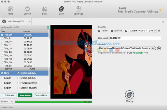 Nhấn nút Copy màu xanh. Ở trên thanh sidebar bên phải, thiết lập Copy to, Disc Label và Save to. Nếu muốn sao chép sang đĩa, bạn cần chèn một đĩa ghi trắng vào ổ đĩa, sau đó lựa chọn ổ đĩa đầu ra trong phần Copy to.