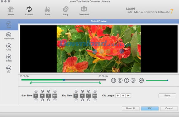 Nhấn tab Trim, kéo hai thanh limit giống hệt nhau trên playbar, hoặc thiết lập Start Time và End Time để cắt video. Điều này sẽ giúp bạn chỉ chuyển đổi video clip mà mình muốn. Nhấn Ok để lưu lại kết quả.