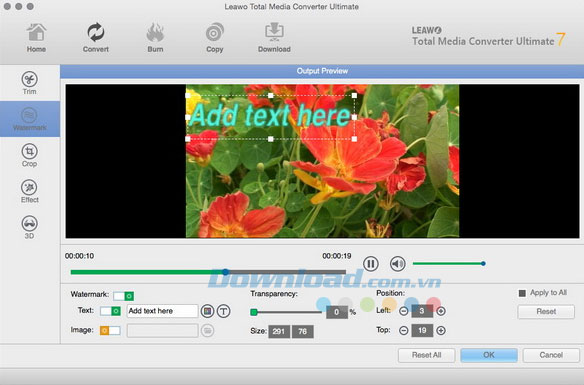Nhấn nút Watermark, sau đó thêm hình mờ văn bản hoặc ảnh. Bạn có thể tùy chỉnh watermark bằng cách thay đổi các thông số như: phông chữ văn bản, kích thước, màu sắc, nội dung, độ trong suốt, vị trí, vv.