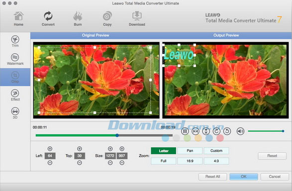 Nhấn nút Crop và thiết lập giá trị Left & Top để loại bỏ những đường viền không mong muốn. Bạn cũng có thể xoay video ở đây bằng cách sử dụng các nút bấm trước thanh điều chỉnh âm lượng.