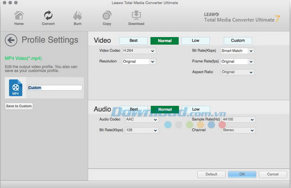 Bạn có thể tùy chỉnh các thông số video và audio đầu ra, bao gồm: video codec, độ phân giải, tốc độ bit, tốc độ khung hình, tỷ lệ video, audio codec, kênh, vv.