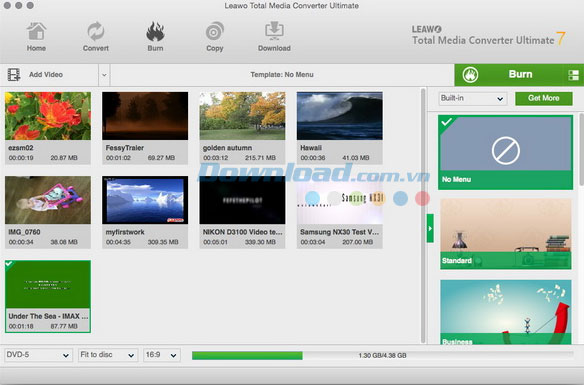 Lựa chọn một menu đĩa cho phim Blu-ray/DVD đầu ra trên thanh sidebar bên phải. Bằng cách nhấn chuột vào giữa menu được lựa chọn thì có thể xem trước các mẫu menu đĩa được lựa chọn. Nếu không cần menu đĩa, chỉ cần lựa chọn “No Menu” ở thanh công cụ bên phải.
