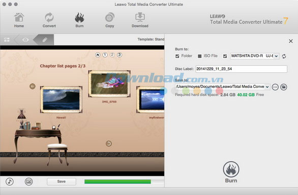 Sau khi lưu lại disc menu, nhấn nút Burn màu xanh. Ngoài ra, bạn cũng có thể thực hiện thêm một vài thiết lập: Burn to, Disc Label và Save to. Nếu muốn ghi video sang đĩa Blu-ray/DVD, cần chèn đĩa trắng vào ổ Blu-ray/DVD, sau đó lựa chọn ổ đĩa trong phần Burn to.